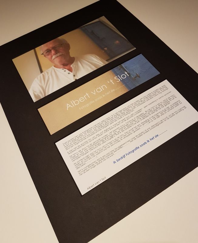Albert van ’t Slot is een rasechte romanticus. De foto’s die hij exposeert hebben twee boeiende thema’s. Het ene bestaat uit sensibele. bijna abstracte beelden die vorm krijgen door zijn oog voor textuur en detail. Daarnaast is er het thema van ,, De Mens’’. Vanuit integere observaties ontstaan boeiende foto’s.  Voor, de als fotograaf autodidacte,  Albert van ’t Slot  is fotograferen geen ,, plaatjes schieten ‘’.   Geen achteraf bewerkingen om tot een glossy beeld te komen. De hier geëxposeerde foto’s zijn het voorlopige resultaat van een  fotografische zoektocht naar  zuivere en inhoudelijke verbeelding van de hem omringende wereld. Soms verstild maar ook heftig.  De foto’s die hij exposeert zijn emotioneel geladen en hij wil ze graag delen met de beschouwer.